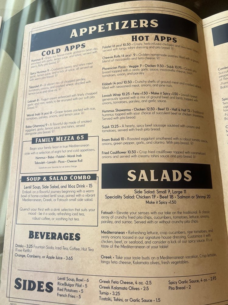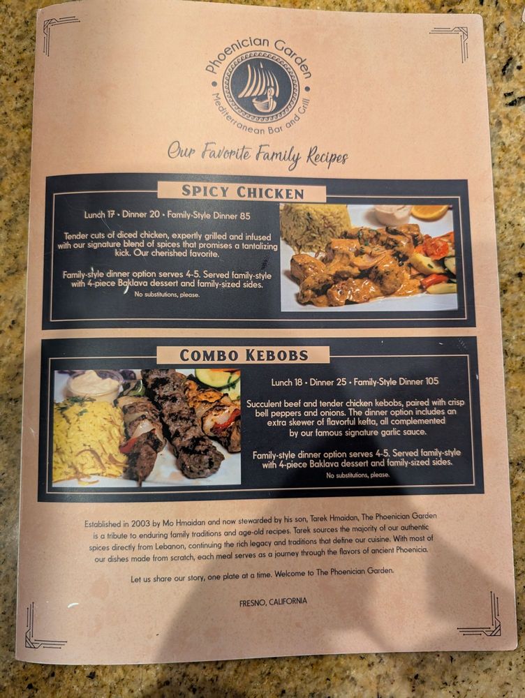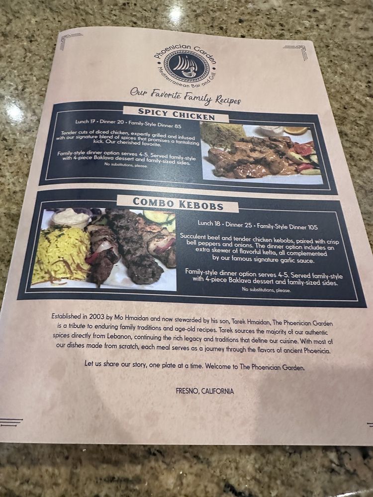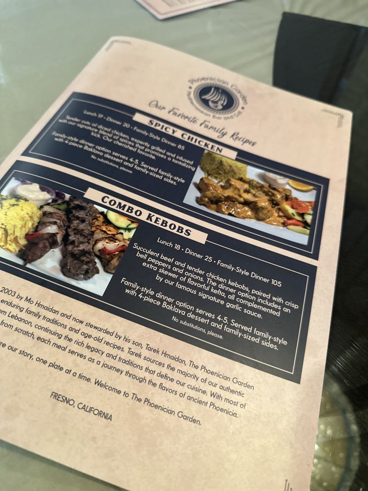 "Introducing the menu at Phoenician Garden Mediterranean Bar and Grill, a Greek restaurant located in Fresno, CA, offers a wide range of authentic Mediterranean dishes with a modern twist. From traditional appetizers like Baba Ghannouj and Cheese Rolls to delicious entrees like Falafel Wraps and Garlic Chicken, every dish is bursting with flavor and made with fresh ingredients. Customers rave about the flavorful Spicy Chicken and juicy Lamb dishes, as well as the generous portion sizes. The ambiance is simple yet relaxing, making it the perfect spot for a casual meal with friends or family. With excellent service from attentive servers like Vartan, Phoenician Garden promises a warm and friendly atmosphere where Mediterranean flavors shine. Whether you're a fan of pescatarian, vegan, or vegetarian options, this restaurant caters to all dietary preferences with high-quality ingredients and generous portions."