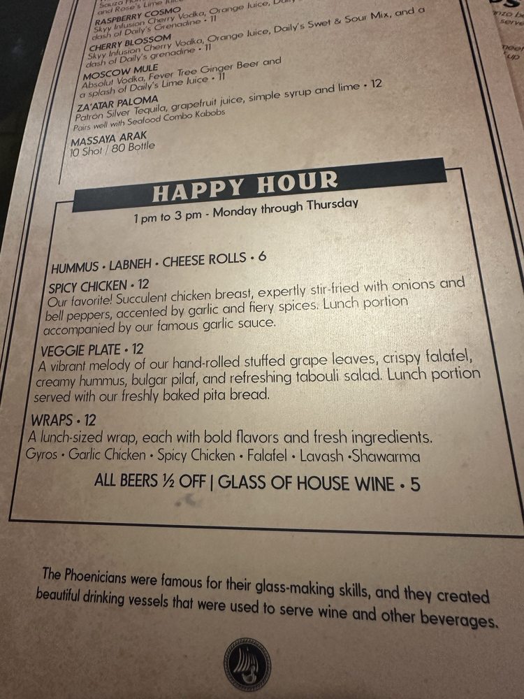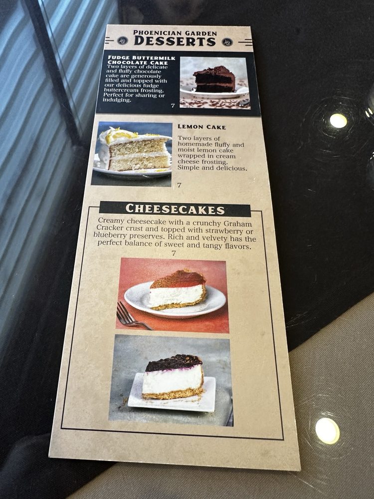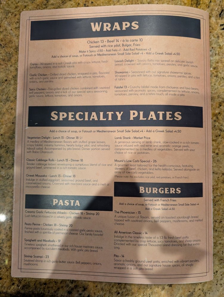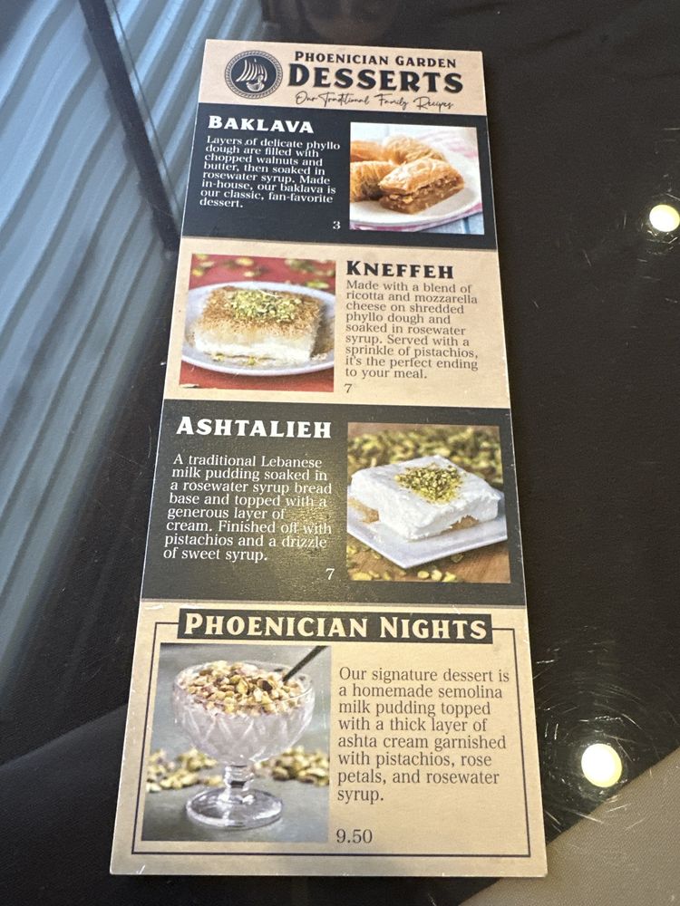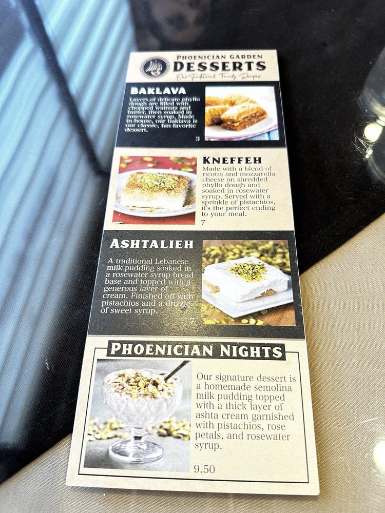 "Introducing the menu at Phoenician Garden Mediterranean Bar and Grill, a Greek restaurant located in Fresno, CA, offers a wide range of authentic Mediterranean dishes with a modern twist. From traditional appetizers like Baba Ghannouj and Cheese Rolls to delicious entrees like Falafel Wraps and Garlic Chicken, every dish is bursting with flavor and made with fresh ingredients. Customers rave about the flavorful Spicy Chicken and juicy Lamb dishes, as well as the generous portion sizes. The ambiance is simple yet relaxing, making it the perfect spot for a casual meal with friends or family. With excellent service from attentive servers like Vartan, Phoenician Garden promises a warm and friendly atmosphere where Mediterranean flavors shine. Whether you're a fan of pescatarian, vegan, or vegetarian options, this restaurant caters to all dietary preferences with high-quality ingredients and generous portions."